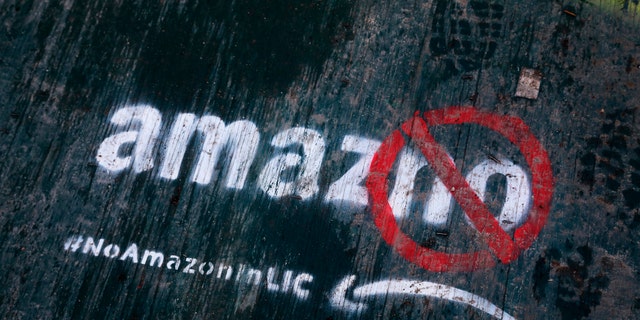 FILE- In this Nov. 16, 2018, file photo graffiti has been painted on a sidewalk by someone opposed to the location of an Amazon headquarters in the Long Island City neighborhood in the Queens borough of New York.